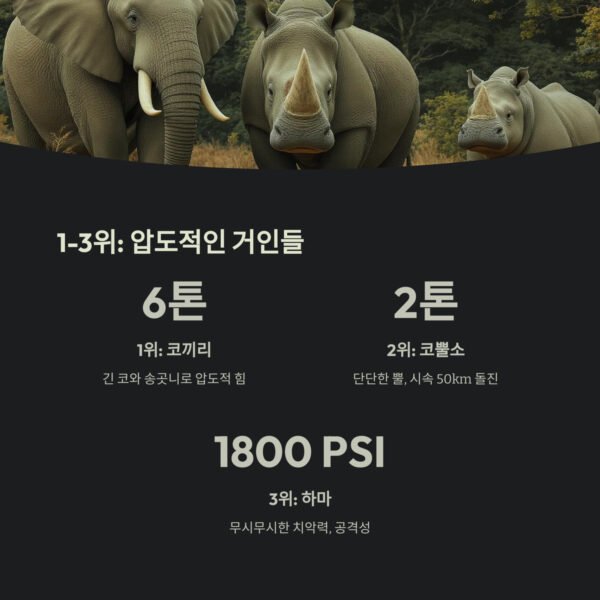 | 1 | 코끼리 | 6톤 | 압도적인 힘, 긴 코 |