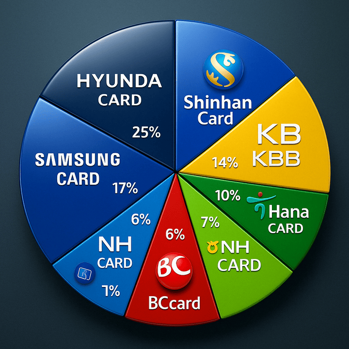 우리카드는 약 70조 원(2022년 기준 9.17% 점유율, thebell, 2022)으로 6위에 올랐어요. 2024년에는 약 75조 원으로 추정되며, 법인 신판 이용금액이 57.6% 증가했죠(thebell, 2021). 시장 점유율은 9.82%예요.